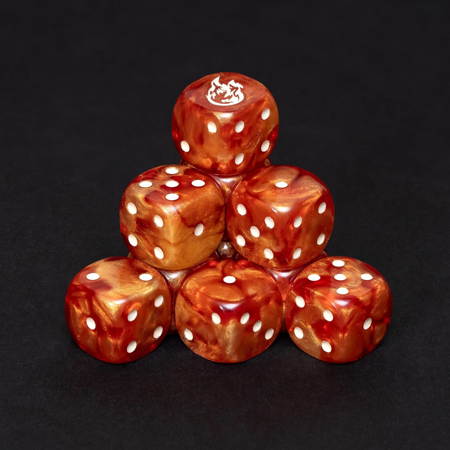 - 🔥 Blazing Design, Spell-Slinger Approved Crafted with fiery red, molten orange, and ruby tones, each die looks like it’s been pulled straight from a mage’s fire pit. Swirls of golden pearl shimmer give them the look of rolling embers—perfect for casting Fireball or dealing massive damage.