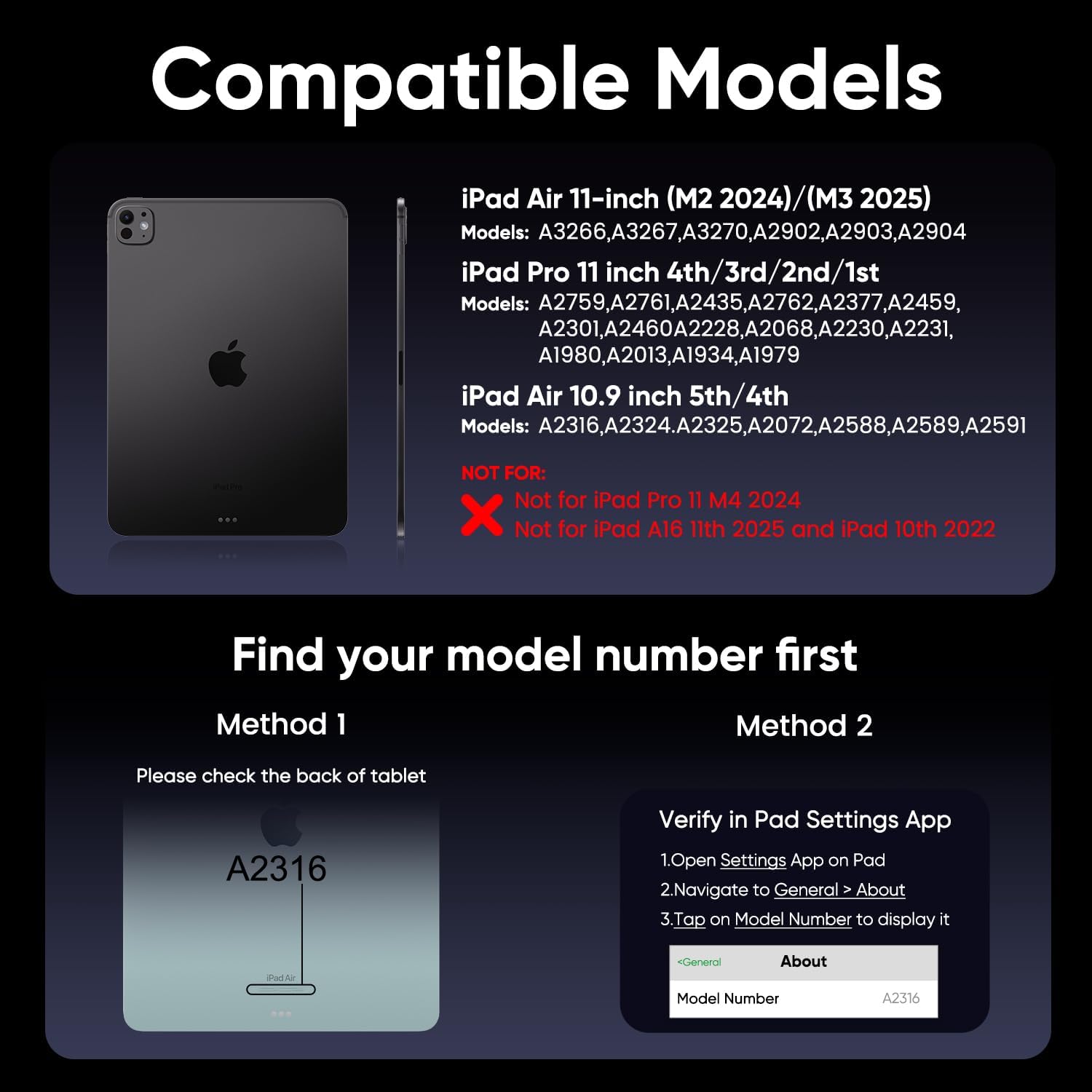 - Only Compatible with iPad Air 11-inch (2024 M2)/(2025 M3) & iPad Pro 11-inch 4th/3rd/2nd/1st gen (2018-2022) , iPad Air 5th and 4th gen.Models include 2024 Air 11 inch (A2902, A2903, A2904),2022 Pro 11 4th Gen (A2759,A2435,A2761,A2762), 2021 Pro 11 3rd Gen(A2377,A2301,A2459,A2460), 2020 Pro 11 2nd Gen(A2228, A2068, A2230, A2231), 2018 Pro 11 1st Gen(A1980,A2013,A1934,A1979), 2022 10.9-inch Air 5th Gen(A2588,A2589,A2591),2020 10.9-inch Air 4th Gen (A2072,A2316,A2324,A2325).NOTE:Not fit for iPad pro 11(M4) 2024,We’re happy to help if you need to check compatibility