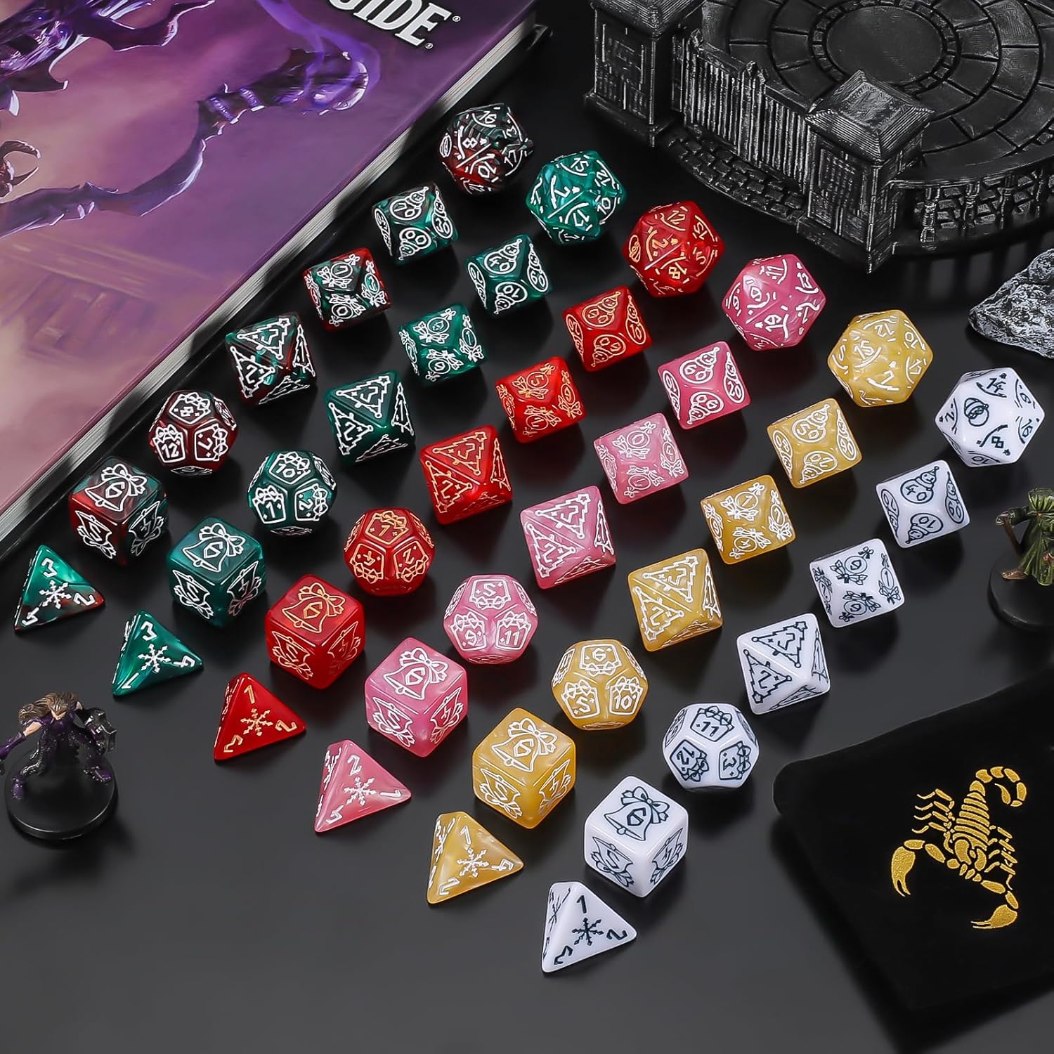 - DICE VARIETY: Each color set includes 7 different dice types - d4, d6, d8, d10, d12, d20, and percentile die for all your gaming needs
