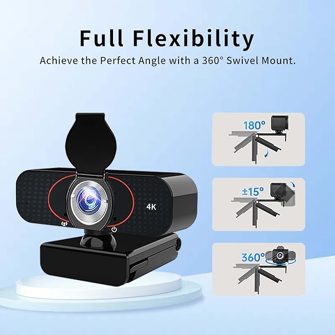 - [Secure Flipping Privacy Shutter+Tripod] 4K webcam with privacy shutter can Instantly cover the lens with a flip—guaranteeing 100% physical privacy protection and keeping dust out.Including tripod makes sure you can not only clip the webcam on to your computer but also can screw on the stand as you like.