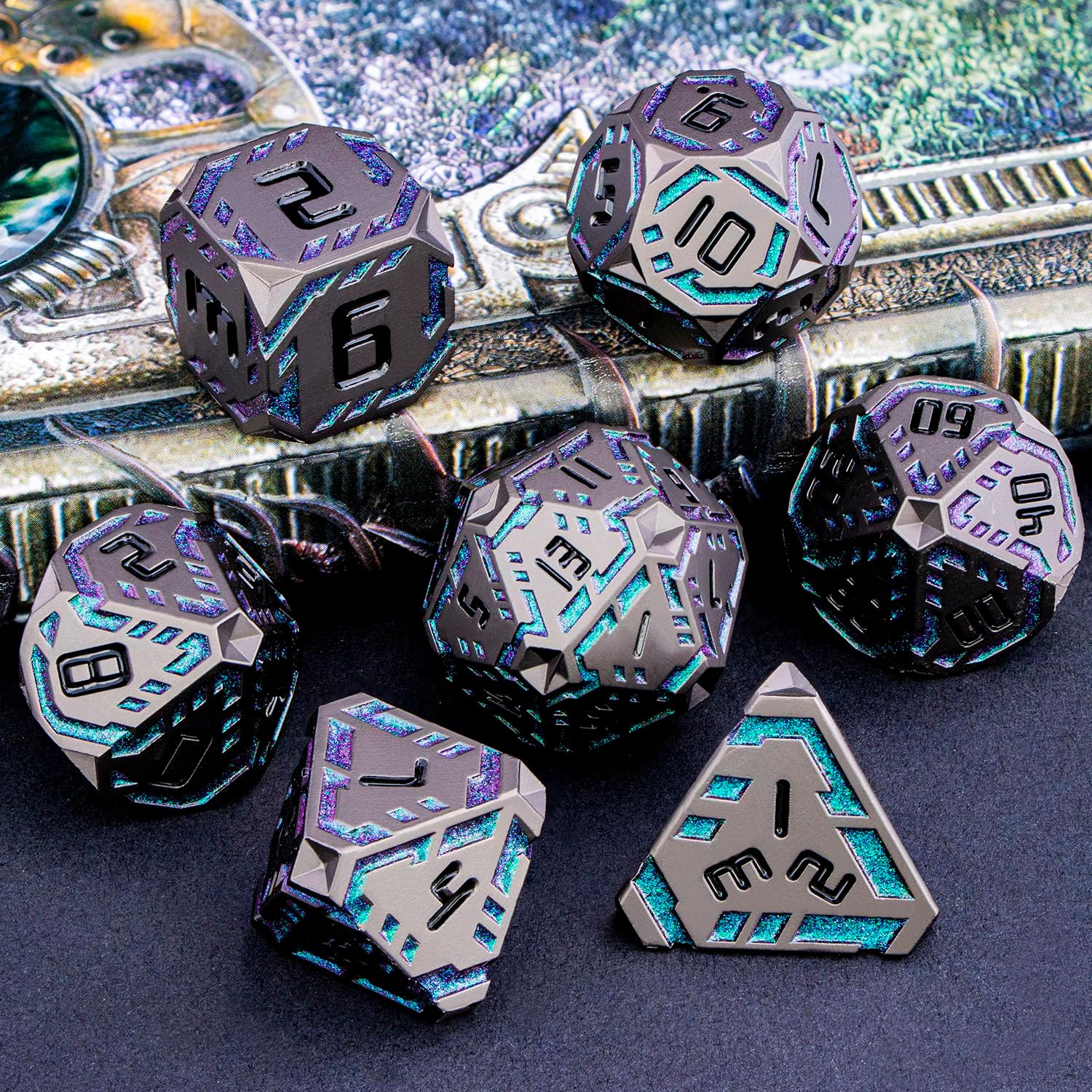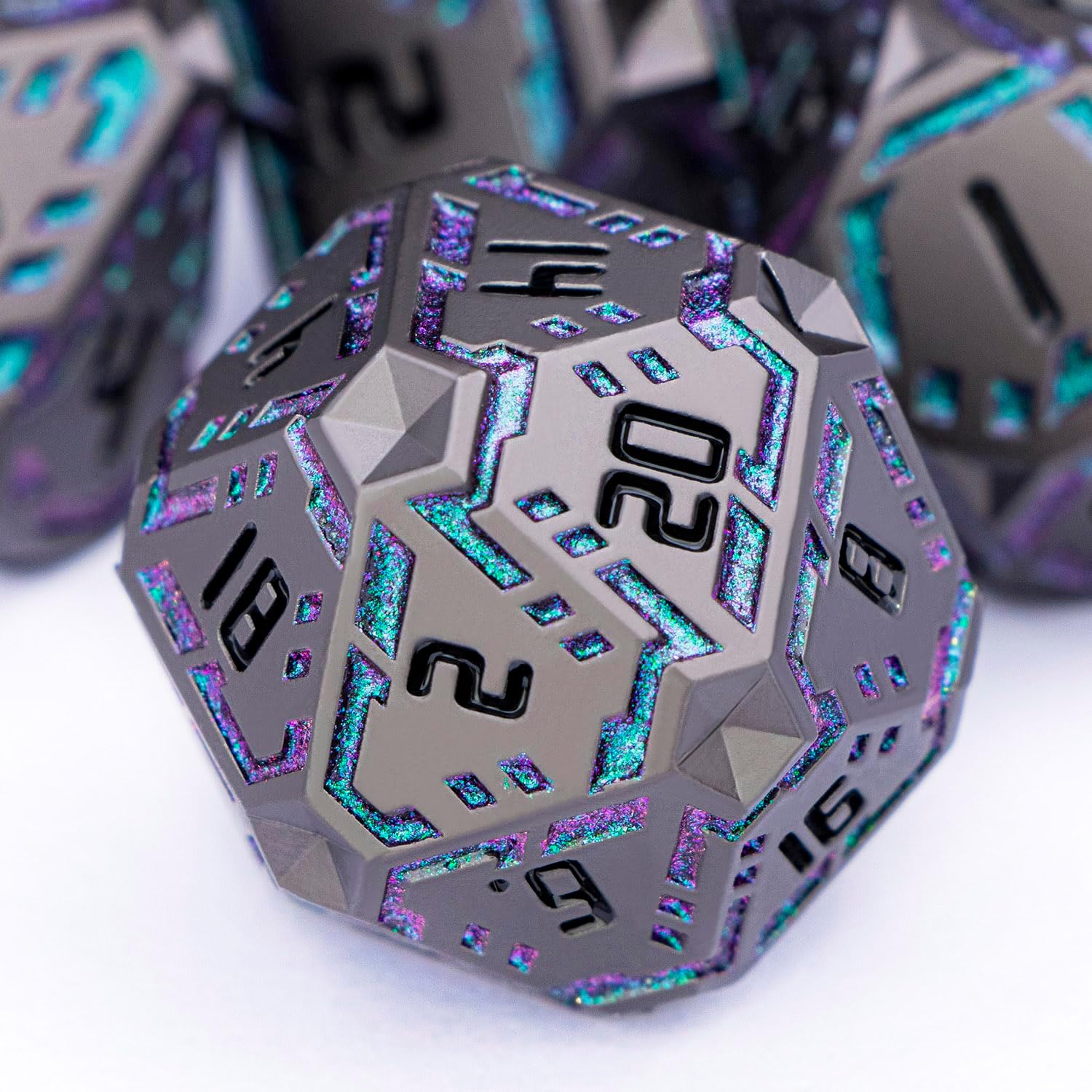 - Science Fiction Style : Designed with a future-tech theme, the dnd dice feature surface-etched stripes symbolizing pulsing energy streams of tomorrow. These dynamic lines traverse the facets, creating a unique ultra-modern, high-tech aesthetic.