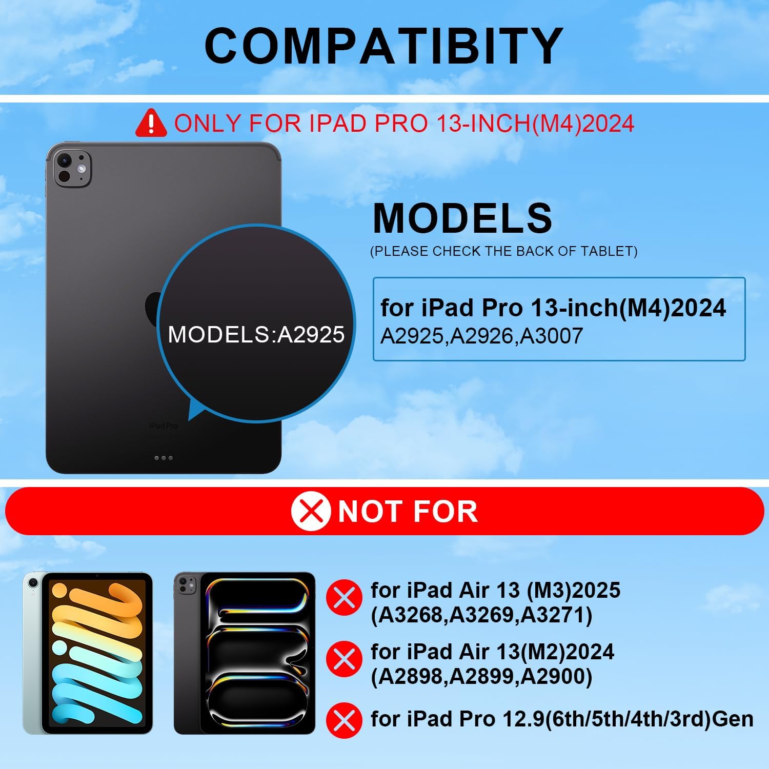 - Compatibility: This premium slim keyboard case is perfectly compatible with iPad Pro 13 inch (M4) 2024 experience with our versatile keyboard case. models include 2024 iPad Pro 13 inch(A2925,A2926,A3007; NOTE:NOT FIT FOR IPAD AIR 13(M3 2025 /M2 2024),Weโre happy to help! Reach out to us if you need to check compatibility