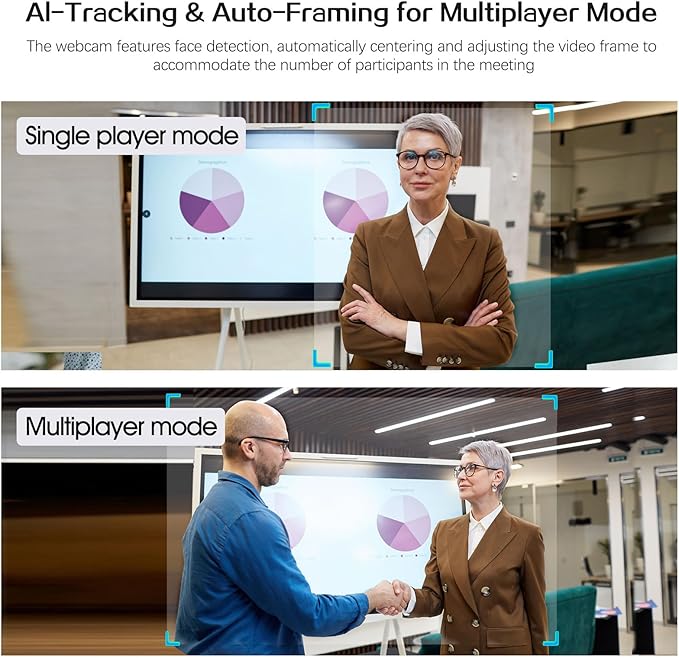 - 【AI Tracking and Auto-Framing】The web camera adopts powerful AI algorithm for humanoid tracking, which can keep the protagonist always in the C position; AI Framing technology, which can automatically detect the number of attendees within the view angle and automatically adjust the viewfinder frame and view angle so that the attendees are always displayed in the center. No need to adjust the web cam frequently, bringing convenience to the meeting.