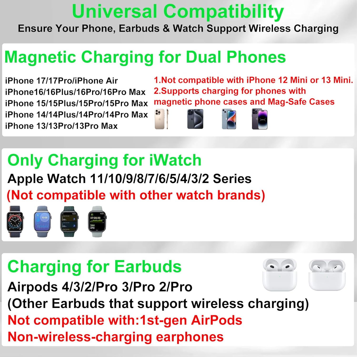 - [Dual Phones Wireless Charging Station for Multiple Devices Apple]: This wireless charging station is designed specifically for Apple devices. The wireless charger can simultaneously charge two phones, for Apple Watch (only compatible with Apple Watch), and for AirPods4/3/2/Pro 2/Pro. Before placing an order, please ensure that your devices support wireless charging.