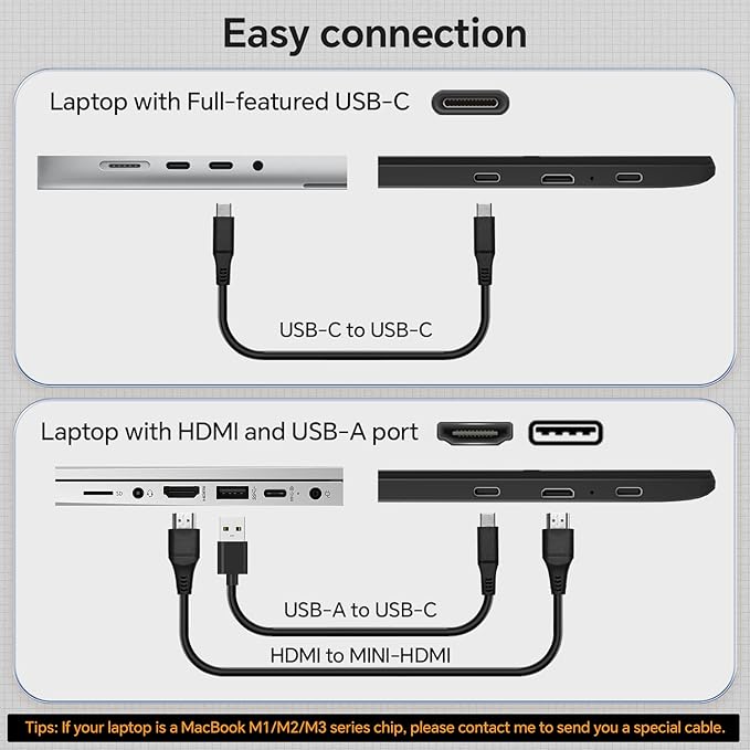 - 【Warranty & Customer Service】FEZOBR offers a 12-month warranty for portable laptop monitor. Due to the limitations of some laptop port types, not all laptops are suitable for this product. If you encounter connection failure, please contact us at anytime and we will provide you with a satisfactory solution. (NOTE: NOT compatible with MacBook M1/M2/M3 chips, MacBook Pro 2012 and earlier, MacBook Air 2016 and earlier.) Please check your laptop chip before purchasing