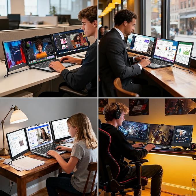 - 【Boost productivity by 300%】Portable monitor for laptop instantly expands your laptop to three screens—view spreadsheets, design tools, and chat simultaneously. The extra screen for laptop switches between extended and duplicate modes, minimizing the strain of switching between tabs. Its ultra-slim form factor, weighing only 4.0 pounds, makes it ideal for mobile work. It's the perfect solution for simultaneous multi-screen and independent displays for laptop users