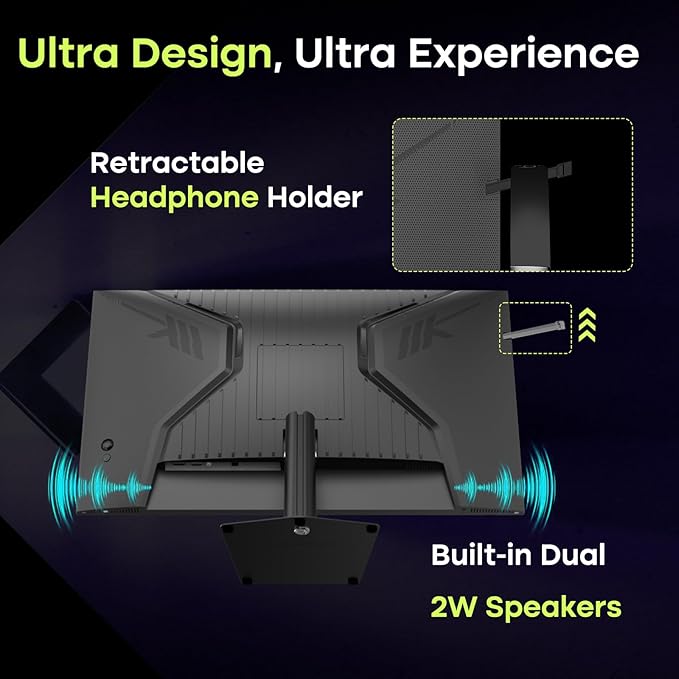 - 【Unique Design】Built-in Speakers for daily play; Headphone Holder for professional gamers, totally convenient for headphone use; Space-saving, steady metal-based, making more usable space on your desktop.The OSD menu includes helpful features such as AI Crosshair and Night Vision to enhance your gaming experience.
