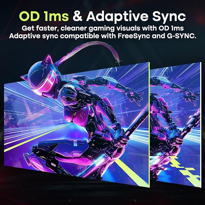 - 【200Hz & 1ms Adaptive-Sync 】 200Hz refresh rate making dynamic images more coherent and avoiding blurring and trailing during rapid movement, 1ms response time help enhance gamers' in-game experience; Adaptive sync effectively reduce screen latency and tearing, Compatible with FreeSync and G-SYNC.