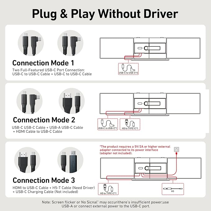 - 【UNIVERSAL COMPATIBILITY】This ultra-thin portable triple-monitor hub offers wide compatibility with systems like Windows, Mac, Chrome OS, Android, and more. For seamless use with Macs featuring M1/M2/M3 chips, simply connect using the included H5-T Cable (driver required). The complete kit comes with all necessary cables and a protective carry bag for a powerful, on-the-go workstation. Please ensure a 5V/2A or higher external adapter is used with the dedicated power port for stable performance