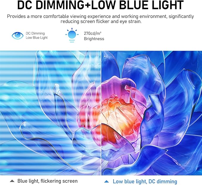 - Comfortable Viewing, Tear-Free Performance:DC dimming and a low blue light panel minimize flicker and reduce eye strain during extended use. Featuring Adaptive Sync technology, the monitor matches the refresh rate of your graphics card to prevent screen tearing and stuttering. A stable 60Hz refresh rate ensures smooth performance in office use and video playback.