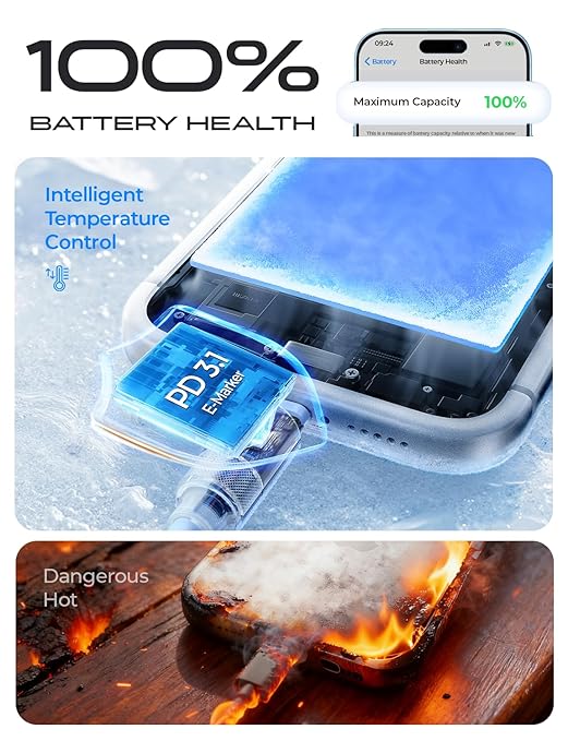 - [Dual-Chip Design: SPEED SAFETY STABILITY] Market-Exclusive Dual E-Marker 3.1 chips enable 100W fast charging with 24/7 protection against over-current, voltage, and temperature. Intelligent temperature control ensures safe operation, while auto power cut-off at 100% charge safeguards battery health. The dual-chip design stabilizes power delivery to eliminate frustrating charging interruptions—no more unexpected disconnections!