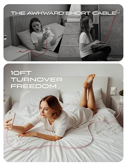 - [10FT/3M: All for Freedom] The 10FT iphone 17 pro max charger cord redefines charging flexibility with its ideal length for every lifestyle scenario. Swap out your restrictive short cable to dominate gaming marathons in the living room—no more crouching near wall outlets! Lounge comfortably on the couch even when the outlet is across the room, or roll freely in bed while binge-watching shows—this cable keeps your device powered without forcing you into awkward positions.