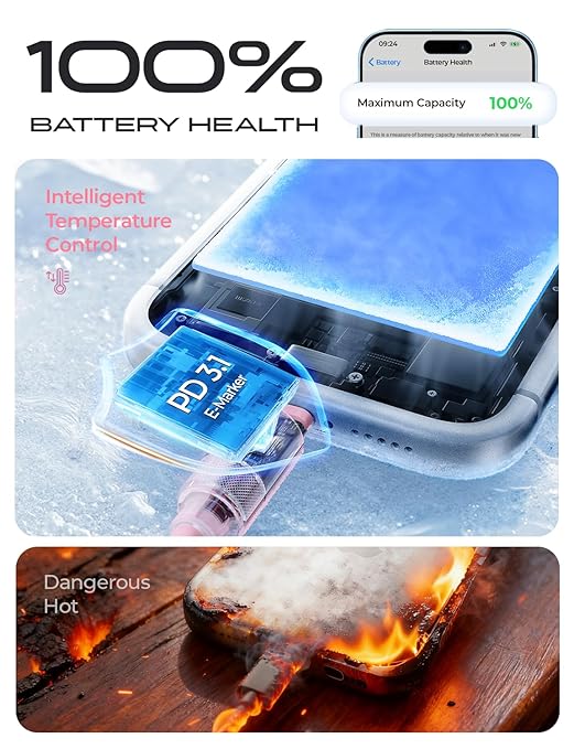 - [Dual-Chip Design: SPEED SAFETY STABILITY] Market-Exclusive Dual E-Marker 3.1 chips enable 100W fast charging with 24/7 protection against over-current, voltage, and temperature. Intelligent temperature control ensures safe operation, while auto power cut-off at 100% charge safeguards battery health. The dual-chip design stabilizes power delivery to eliminate frustrating charging interruptions—no more unexpected disconnections!