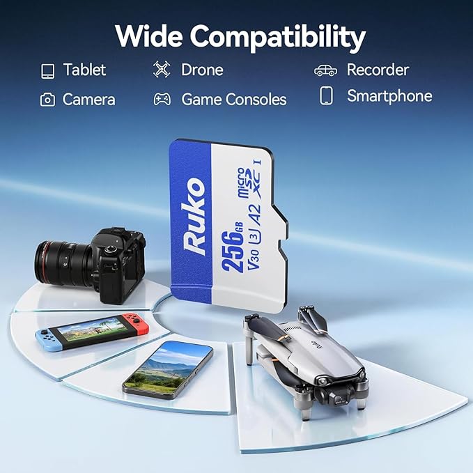 Ruko 256GB Micro SD Card with Adapter & Reader, A2, Class10, UHS-I U3/V30, 4K UHD, Up to 100MB/s Read, TF Memory Card for Drone, Camera, Gaming Console