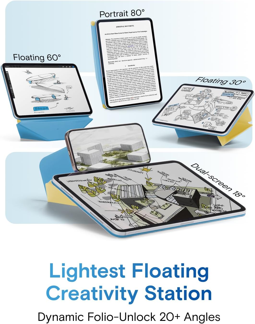 - Ultimate Ergonomic Floating Modes - MOFT Dynamic Folio Case makes iPad ergonomics effortless for mobile creativity - featuring a single-piece structure that effortlessly folds into a workstation lifting iPads up 2-inches. Frictionless angle shifts between 30° and 60° keep you aligned in your input-output framework.