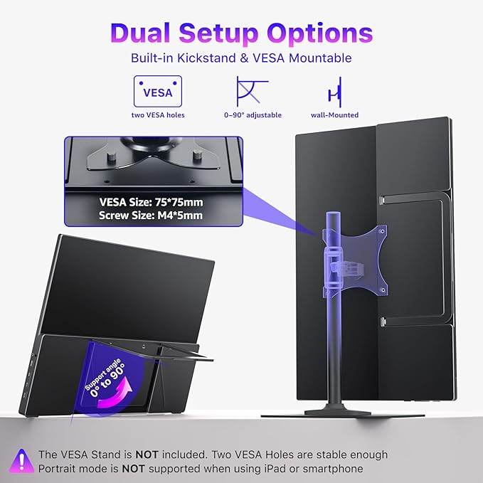 - Built-In Adjustable Metal Kickstand for Work & Travel: Designed for maximum convenience, this 15.6” portable monitor features a sturdy integrated metal kickstand that offers stable support and a wide range of viewing angles, whether you're working at a café, office, hotel, or on the go. Easily fold it down for compact storage in the included protective sleeve.