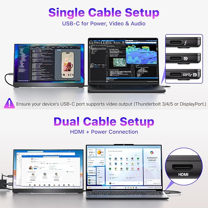 - Effortless Plug and Play via USB-C & Standard HDMI: Connect seamlessly to laptops, PCs, MacBooks, Surfaces, PS5, Xbox, and more using the full-featured USB-C or the upgraded standard HDMI port for enhanced compatibility and durability. For laptops/PCs with USB-C DisplayPort Alt Mode, a single original USB-C cable handles both power and video, delivering a smooth, true plug-and-play dual-screen experience.