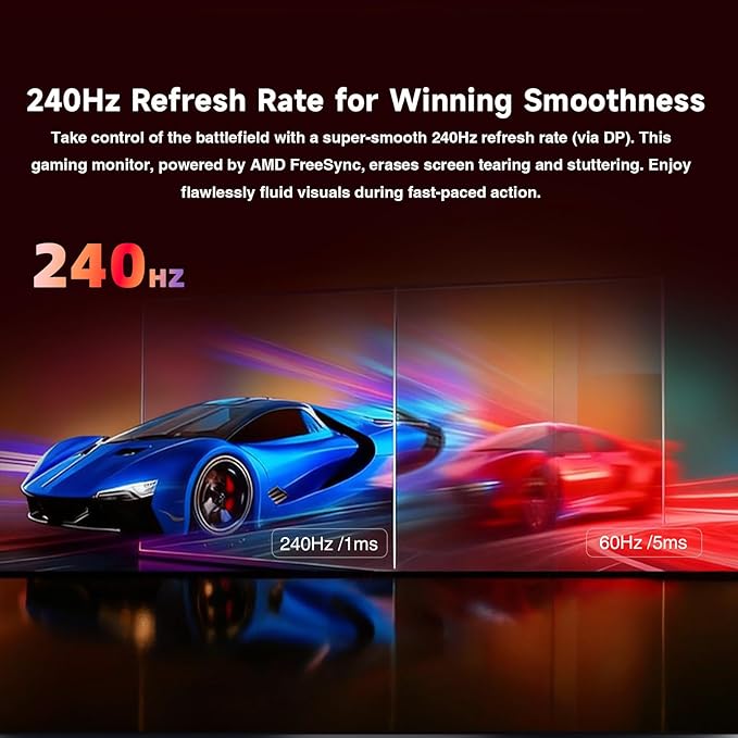 - Smooth Beyond Limits: 240Hz & 1ms for Championship-Level Play Experience absolute fluidity with no ghosting or tearing. The combination of a 240Hz ultra-high refresh rate and 1ms rapid response time ensures every flick-shot, turn, and high-speed movement is rendered with flawless clarity, giving you a millisecond-edge in competitive titles like Call of Duty and Apex Legends.
