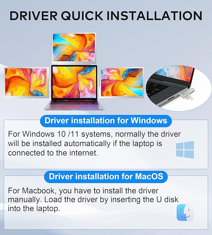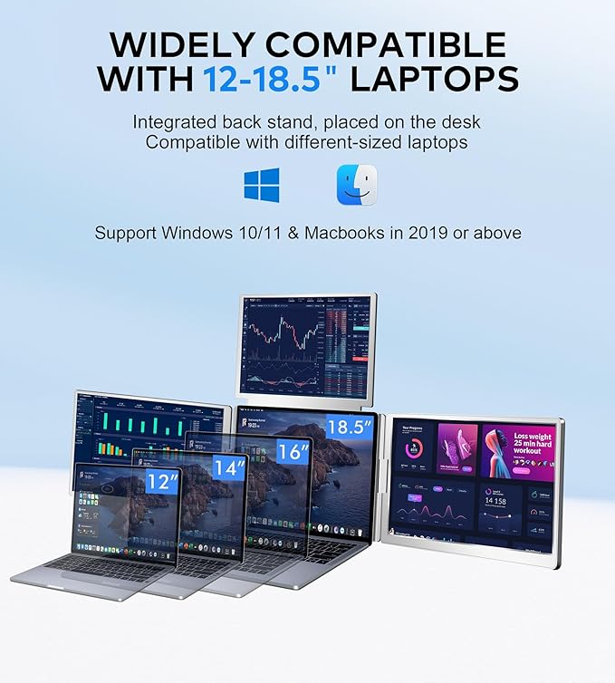 - Seamless Connectivity: With Just 1 Cable for 3 Screens, our laptop screen extender is compatible with Windows (Win10 and later) and macOS (2019 or later Macbooks including M1, M2, M3 chipsets) for laptops ranging from 13.6" to 17.3". (Please note: Not applicable to Microsoft Surface series and Chormebook). Whether you choose a USB-C or USB-A connection(Support: Thunderbolt 3/4/ USB-C/ USB-A), it's easy to connect with just 1 cable. (Please connect PD power supply when you use the quad monitor.)