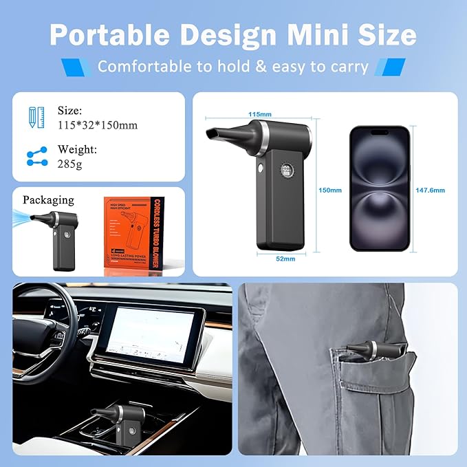 - 【Ultra Compact & Portable Mini Air Blower】Weighs just 0.7 lbs,Small size and light weight to slip into your toolbox, tote bag, or even your pocket. Take it anywhere effortlessly for on-the-go cleaning needs without taking up too much space.