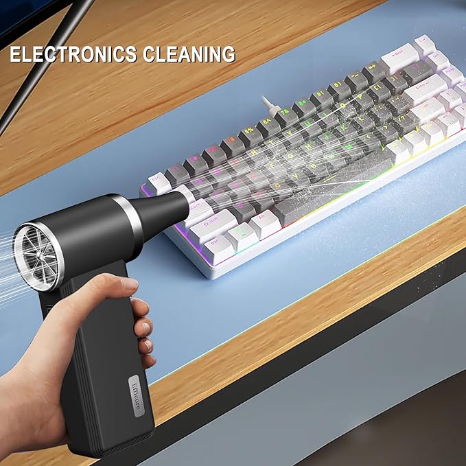 - 【High-Power Brushless Motor & 180K RPM Speed 】– Equipped with 180K RPM brushless motor, this cordless electric air duster delivers a powerful 82 m/s airflow for superior dust removal. It outperforms with 4 adjustable speeds (Gentle to Turbo), giving you precise control for cleaning keyboards, PC components, cameras, electronics, car, woodworking, and hard-to-reach areas. The cordless, lightweight design ensures easy, versatile cleaning anywhere—no cords, no hassle.