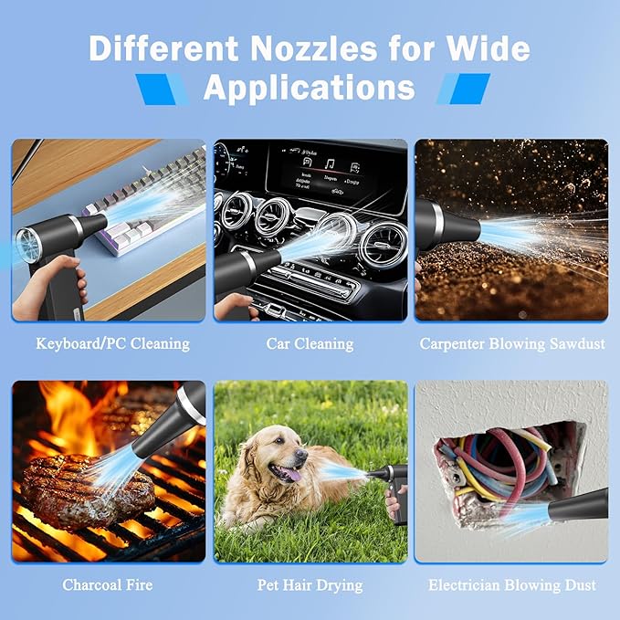 - 【1-Hour Full Charge & Long-Lasting Battery】– The compressed air duster supports 45W USB-C SuperFast Charging, so you can fully charge the dust blower from 0-100% in just 1 hour. Powered by a high-capacity 2×4000 mAh lithium batteries (29.6 Wh), this rechargeable air duster delivers extended runtime perfect for diverse tasks: quickly dusting home office electronics, blowing away woodworking debris, clearing workshop dust. Tip: For best performance, fully charge before first use.
