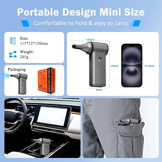 - 【Ultra Compact & Portable Mini Air Blower】Weighs just 0.7 lbs,Small size and light weight to slip into your toolbox, tote bag, or even your pocket. Take it anywhere effortlessly for on-the-go cleaning needs without taking up too much space.