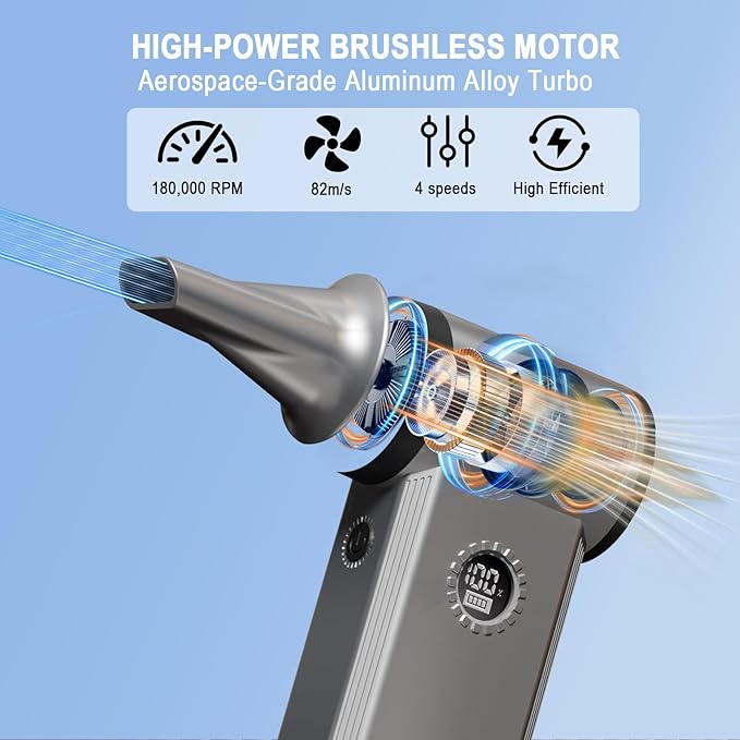 - 【High-Power Brushless Motor & 180K RPM Speed 】– Equipped with 180K RPM brushless motor, this cordless electric air duster delivers a powerful 82 m/s airflow for superior dust removal. It outperforms with 4 adjustable speeds (Gentle to Turbo), giving you precise control for cleaning keyboards, PC components, cameras, electronics, car, woodworking, and hard-to-reach areas. The cordless, lightweight design ensures easy, versatile cleaning anywhere—no cords, no hassle.