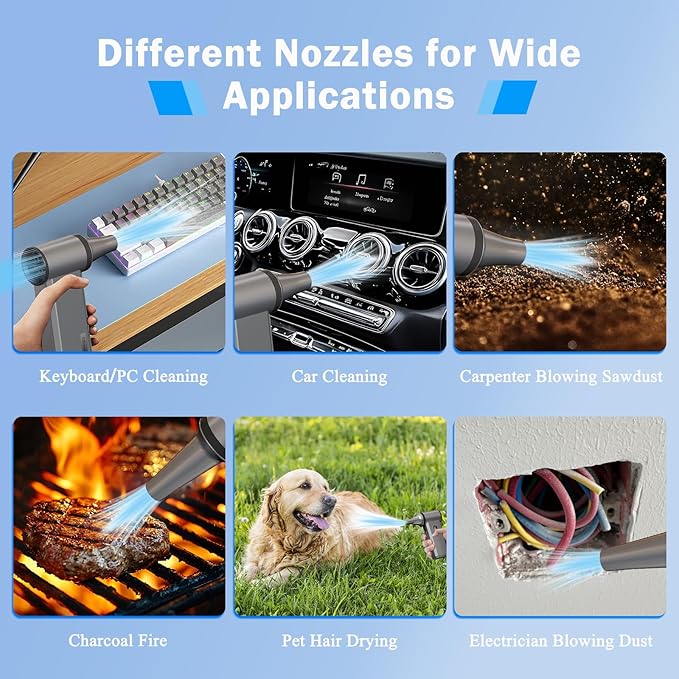 - 【1-Hour Full Charge & Long-Lasting Battery】– The compressed air duster supports 45W USB-C SuperFast Charging, so you can fully charge the dust blower from 0-100% in just 1 hour. Powered by a high-capacity 2×4000 mAh lithium batteries (29.6 Wh), this rechargeable air duster delivers extended runtime perfect for diverse tasks: quickly dusting home office electronics, blowing away woodworking debris, clearing workshop dust. Tip: For best performance, fully charge before first use.
