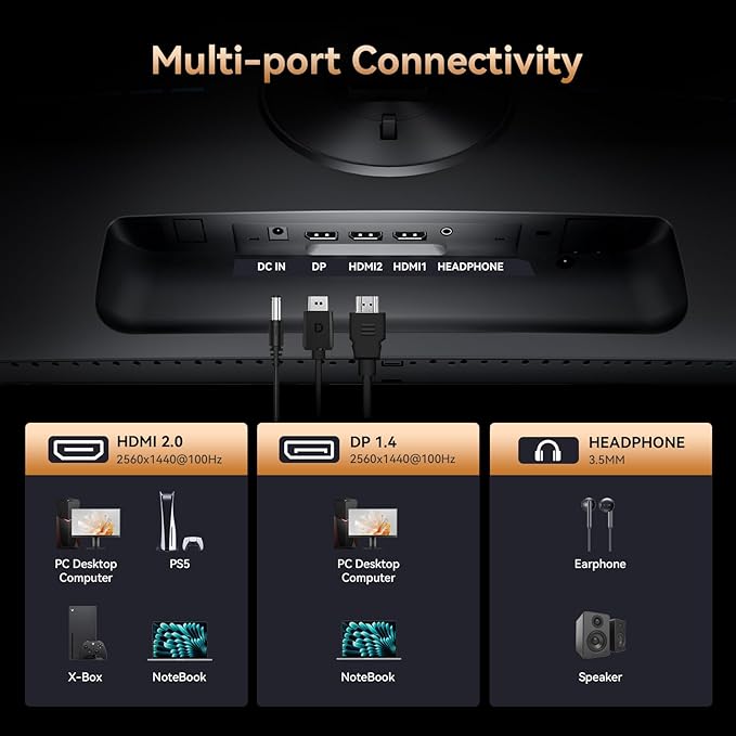 - Plug & Play Connectivity: Connect effortlessly to PC and game consoles via HDMI 2.0 and DisplayPort 1.4 ports. The integrated LED backlight on the rear instantly illuminates upon connection, adding vibrant flair to your gaming setup, while remaining optional via menu control. A dedicated headphone jack is also included for private, immersive audio during gaming or movie sessions.