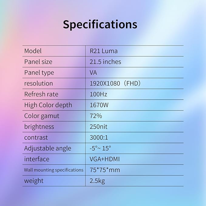 21.5-inch Full HD (1920 x 1080) Gaming Office Monitor,100Hz, 100% sRGB,VA Panels Computer Monitor, VESA 75 * 75mm Compatible, 3000:1 Contrast Ratio, HDMI & VGA Ports (R21 Luma)